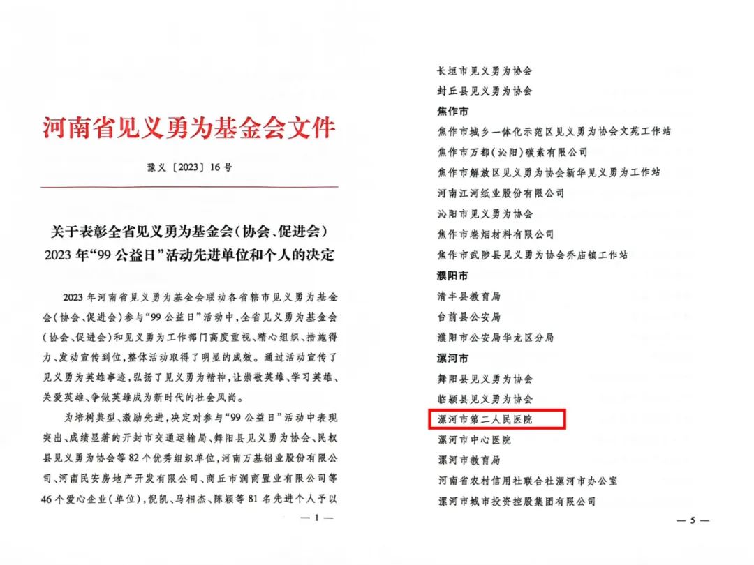 近日,市二院被河南省見(jiàn)義勇為基金會(huì)授予全省2023年“99公益日”活動(dòng)先進(jìn)單位榮譽(yù)稱號(hào)。