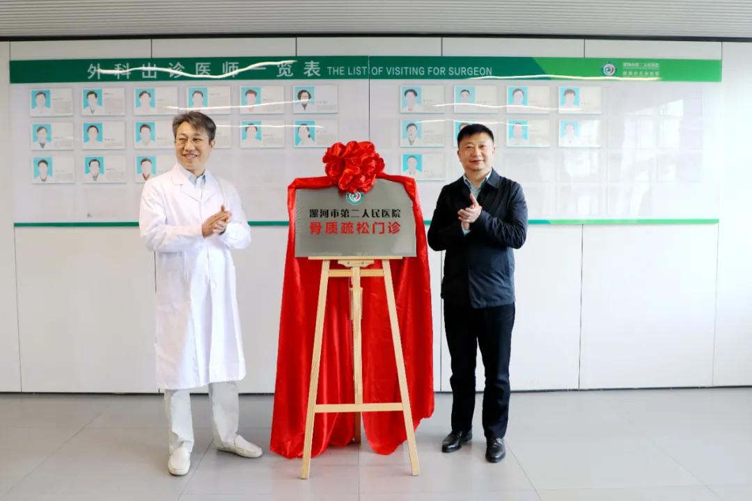 儀式現(xiàn)場(chǎng),黨委書記魏松與黃宗強(qiáng)教授共同為“漯河市第二人民醫(yī)院骨質(zhì)疏松門診”揭牌。