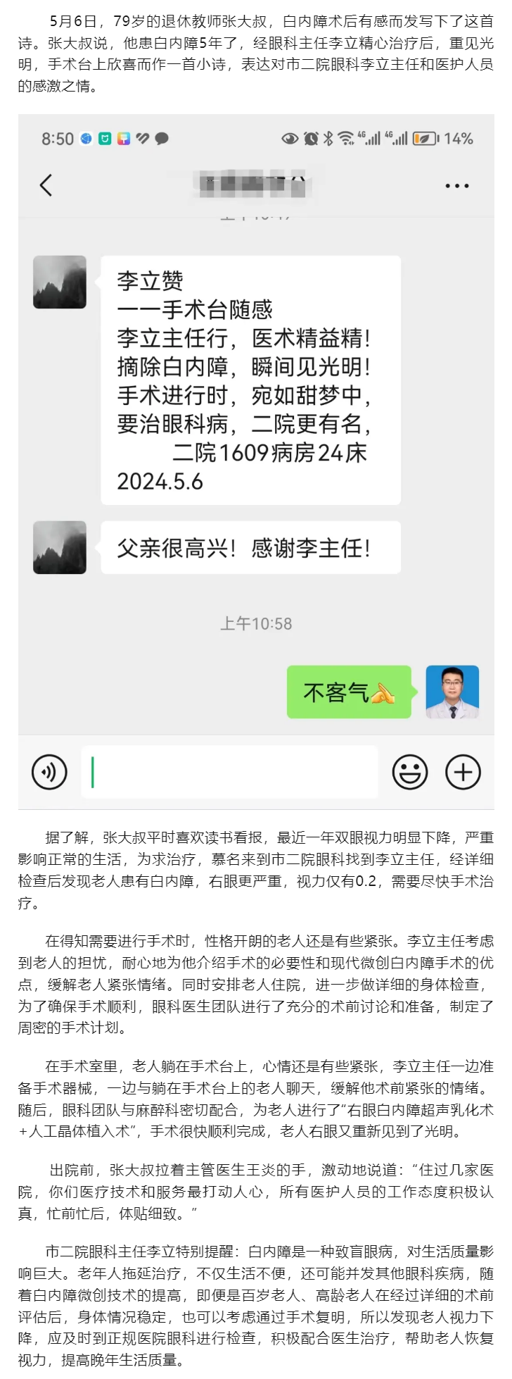 患者賦詩向市二院眼科醫(yī)護(hù)人員表示感謝
