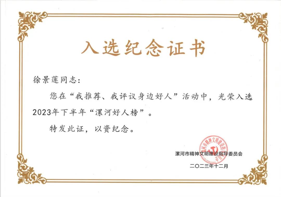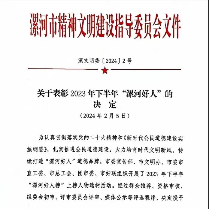 為認(rèn)真貫徹落實黨的二十大精神和《新時代公民道德建設(shè)實施綱要》,扎實推進(jìn)公民道德建設(shè),大力培育時代文明新風(fēng),持續(xù)打造“漯河好人”道德品牌,市委宣傳部、市文明辦、市委市直工委、市總工會、團(tuán)市委、市婦聯(lián)組織開展了2023年下半年“漯河好人榜”上榜人物選樹活動。經(jīng)過群眾推薦、資格審核、組委會初審、評審委員會評審、媒體公示等評選程序,共12人上榜。