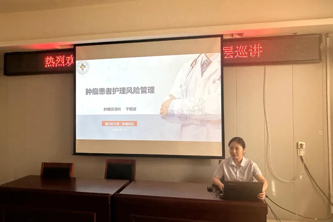 此次巡講中,于楊波護士長、張姣主管護師、王惠娟主管護師分別就《腫瘤患者護理風(fēng)險管理》《靜脈治療血管通路管理規(guī)范》《腫瘤患者癌痛規(guī)范化管理》為主題進行了精彩分享。其中于楊波護士長主要是從腫瘤患者常見的護理風(fēng)險問題如何識別、評估、規(guī)范管理以及護理風(fēng)險管理的一些措施、經(jīng)驗、理念進行了分享。