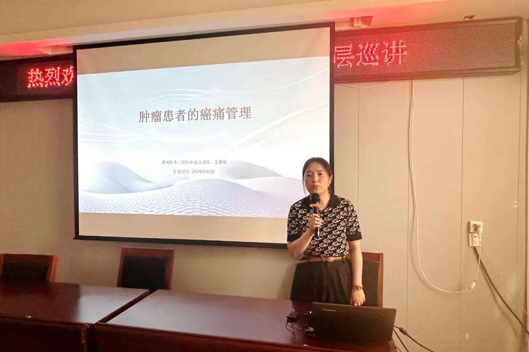 王惠娟主管護師以《腫瘤患者癌痛規(guī)范化管理》為主題,分享了腫瘤患者癌痛的規(guī)范化管理、評估,藥物的三階梯,常見的止疼藥應(yīng)用過程中的誤區(qū)以及中醫(yī)護理適宜技術(shù)在癌痛中的應(yīng)用等內(nèi)容。