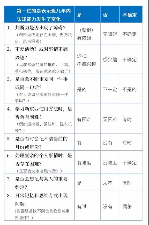 目前比較常用的是AD8癡呆篩查量表,它通過8個簡單的問題,快速評估是否有阿爾茨海默病風(fēng)險。如果出現(xiàn)2個及以上的表現(xiàn),則要及時到醫(yī)院就診咨詢,進(jìn)一步明確診斷。 (殷旭芳)