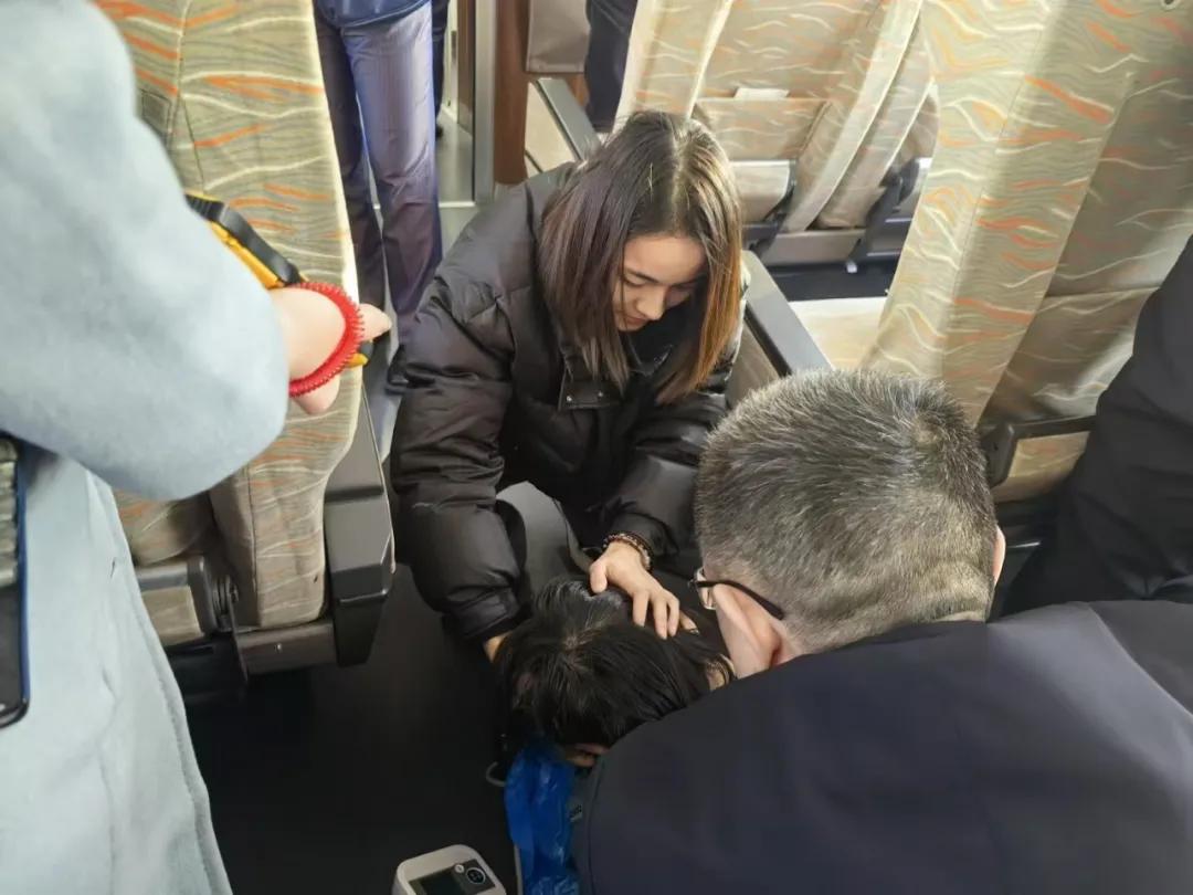 為了確保旅客的安全,王爽和張圓圓決定留在她身邊,密切觀察病情變化。時間一分一秒過去,10多分鐘后,旅客的頸動脈波動突然變得微弱,意識也開始喪失。這一刻,張園園迅速反應(yīng),立即給予心臟按壓。經(jīng)過一番努力,旅客的意識逐漸恢復(fù),但緊接著,她又嘔吐起來,嘔吐物不偏不倚地濺在了張圓圓的身上。面對這突如其來的狀況,張圓圓沒有絲毫的嫌棄或抱怨,只是簡單地擦拭了一下身上的污物,便又立即投入到對旅客的監(jiān)護(hù)中。王爽也迅速協(xié)助清理現(xiàn)場,確保旅客周圍環(huán)境的整潔與安全。然后再次回到旅客身邊,繼續(xù)觀察病情,測量生命體征。