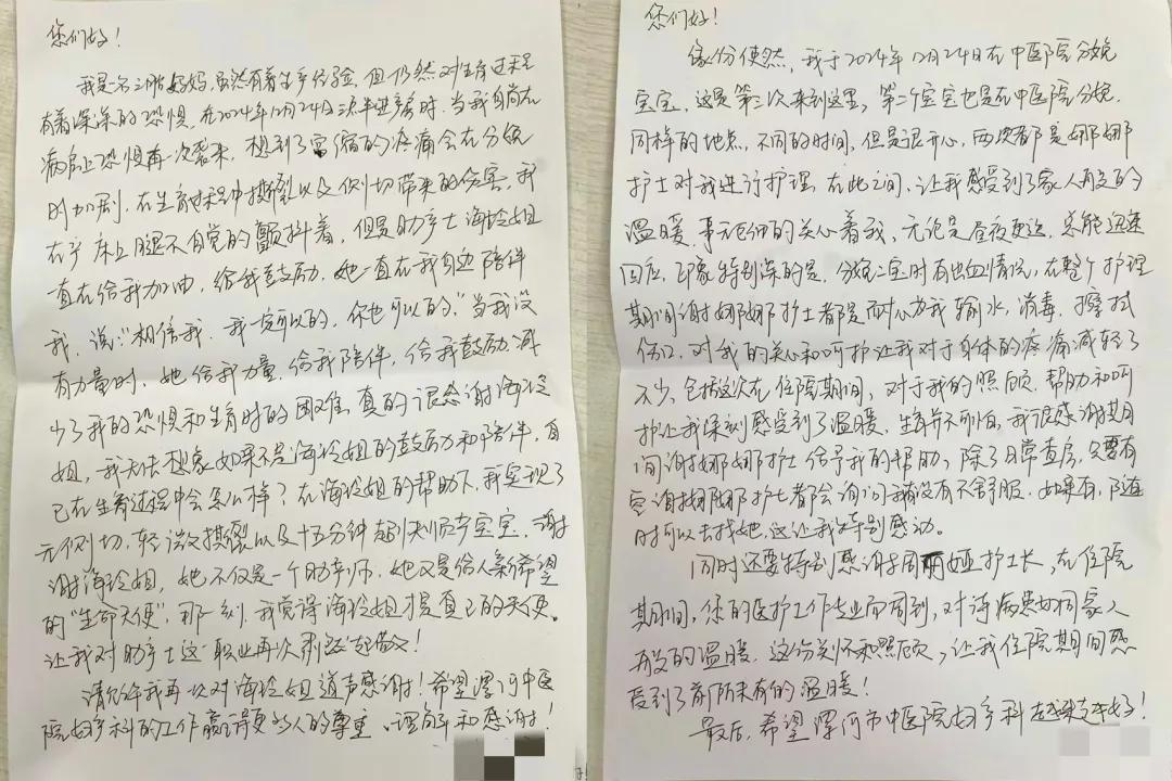 手寫的感謝信表達了對護士長周麗婭暖心細致的全程護理服務(wù),助產(chǎn)士朱海玲專業(yè)的助產(chǎn)技術(shù)及心理支持,助力寶寶平安生產(chǎn)以及謝娜娜護士耐心細致的護理和陪伴,讓她十分感動,住院期間感受到了家的溫暖和如親人般的陪伴。這些都如涓涓細流滋潤著寶媽和家屬的心田,并以寫信的方式表達對婦產(chǎn)科團隊優(yōu)質(zhì)護理服務(wù)的認可。