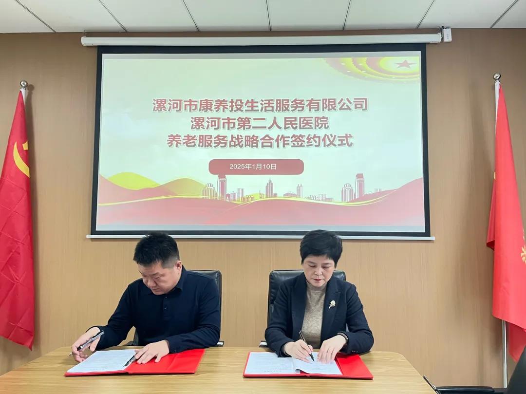 為探索醫(yī)養(yǎng)結(jié)合工作新模式,助力我市構(gòu)建醫(yī)養(yǎng)結(jié)合的養(yǎng)老服務(wù)體系新路徑,1月10日下午,市二院作為全市首家簽約單位與漯河市康養(yǎng)投公司簽訂醫(yī)養(yǎng)戰(zhàn)略合作協(xié)議,為漯河地區(qū)智慧養(yǎng)老的發(fā)展注入了新活力。市民政局養(yǎng)老科科長趙煒,市康養(yǎng)投生活公司董事長靳元浩,市二院副院長劉橋、醫(yī)聯(lián)體辦公室副主任張靜出席簽約儀式。