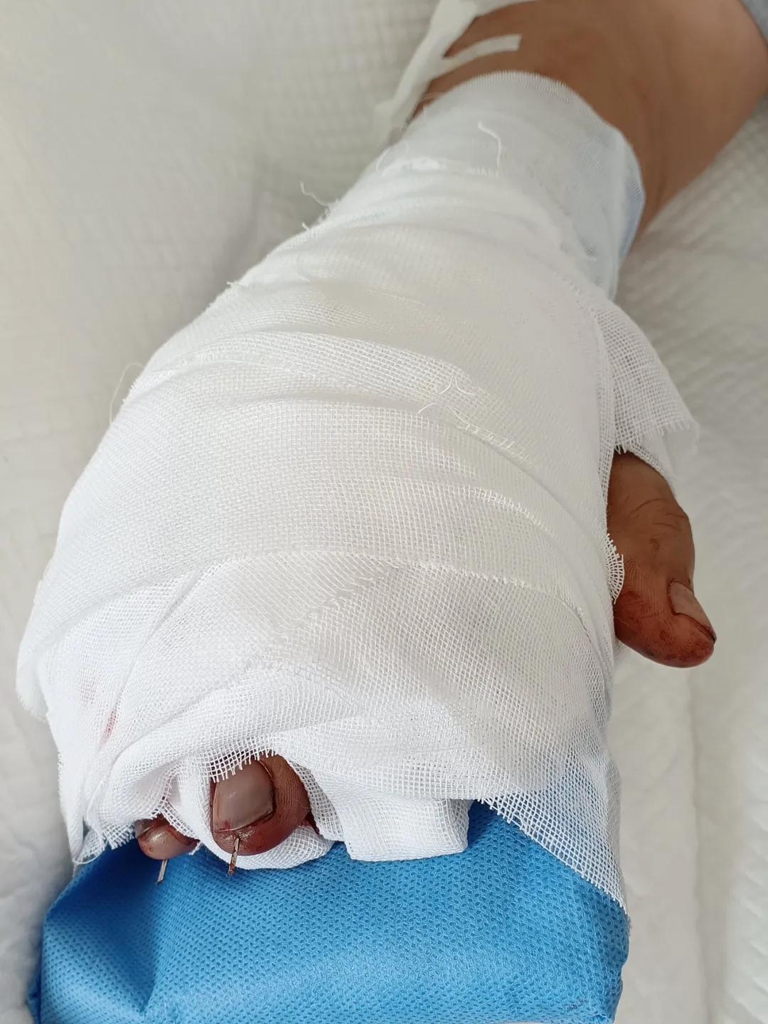 5月20日,市二院顯微外科燒傷整形科收治了3例因麥?zhǔn)毡晦r(nóng)機“咬傷”、農(nóng)具劃傷的患者。其中,56歲的劉某在收麥子時被打谷機皮帶絞傷右手,致手掌、食指、中指、環(huán)指嚴(yán)重毀損傷,骨、關(guān)節(jié)外露,因當(dāng)?shù)蒯t(yī)院無法治療,被家人緊急送往市二院顯微手足燒傷整形外科救治。“當(dāng)時整個右手血肉模糊,看上去都是爛的,我以為這個手是肯定保不住了。”患者家屬回憶當(dāng)時的場景仍然膽戰(zhàn)心驚。