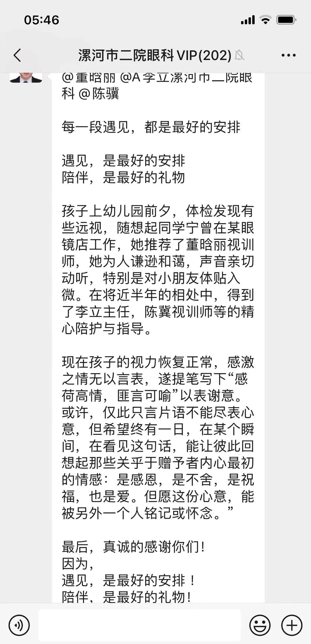 經(jīng)過半年多的康復(fù)訓(xùn)練,祺寶雙眼視力均提升到了該年齡段的正常水平0.5。祺寶的爸爸非常激動,為了表達(dá)對市二院眼科視覺康復(fù)中心全體醫(yī)護(hù)人員的感激之情,他親手創(chuàng)作了兩幅字畫,并在微信群發(fā)送了感謝信,代表了家長對醫(yī)護(hù)人員的深深敬意,更見證了市二院眼科團(tuán)隊(duì)在視覺康復(fù)領(lǐng)域的專業(yè)與付出。
