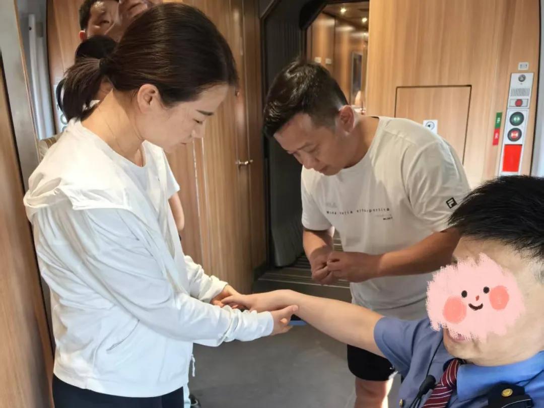 抵達(dá)現(xiàn)場,他們發(fā)現(xiàn)一名身著列車員制服的男性工作人員面色慘白、冷汗淋漓,因腰部劇痛蜷縮并呻吟。憑借豐富經(jīng)驗(yàn),兩人判斷其可能是腎結(jié)石引發(fā)的腎絞痛。在列車工作人員協(xié)助下,潘建濤施展中醫(yī)針灸,李璐同步監(jiān)測生命體征、安撫患者。經(jīng)救治,患者疼痛明顯減輕。他們向列車方交代后續(xù)注意事項(xiàng)后默默返回座位。