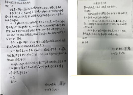 在漯河醫(yī)專二附院泌尿-肛腸外科全體醫(yī)護人員的精心治療和悉心照料下,患者術(shù)后恢復(fù)良好,順利出院。出院之際,患者特意寫下兩張感謝信,分別贈予閆衛(wèi)甫主任團隊和護理團隊。信中,老人深情地寫道:“你們用專業(yè)的技術(shù),耐心的關(guān)懷,讓我再在病痛中感到了安心,看到了希望,你們不僅用醫(yī)術(shù)守護健康,更用真誠撫慰了患者的心靈。”(盧闖 田向榮 劉旭 袁錦鈺)