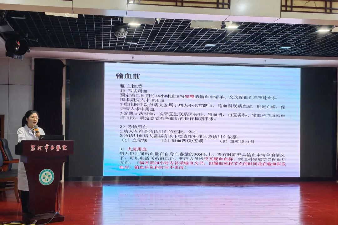 為進一步規(guī)范臨床輸血操作流程,強化醫(yī)護人員輸血安全意識,保障患者用血安全與醫(yī)療質(zhì)量,2025年9月12日至13日,漯河市中醫(yī)院輸血檢驗科在四樓會議室對全院醫(yī)護人員分批開展臨床輸血專項培訓(xùn)。培訓(xùn)由輸血檢驗科張丹丹講解。
