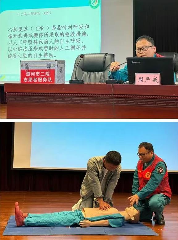 隨后,急診科副主任醫(yī)師周嚴(yán)威圍繞《應(yīng)急急救技能實操》進(jìn)行專題講解與現(xiàn)場演示,重點聚焦海姆立克急救法與心肺復(fù)蘇術(shù)兩大關(guān)鍵技能。為讓職工更直觀掌握動作要領(lǐng),周嚴(yán)威副主任醫(yī)師使用人體模型進(jìn)行多輪演示,同時邀請現(xiàn)場職工上臺實操練習(xí),確保每位參與實操的職工都能規(guī)范掌握核心步驟。