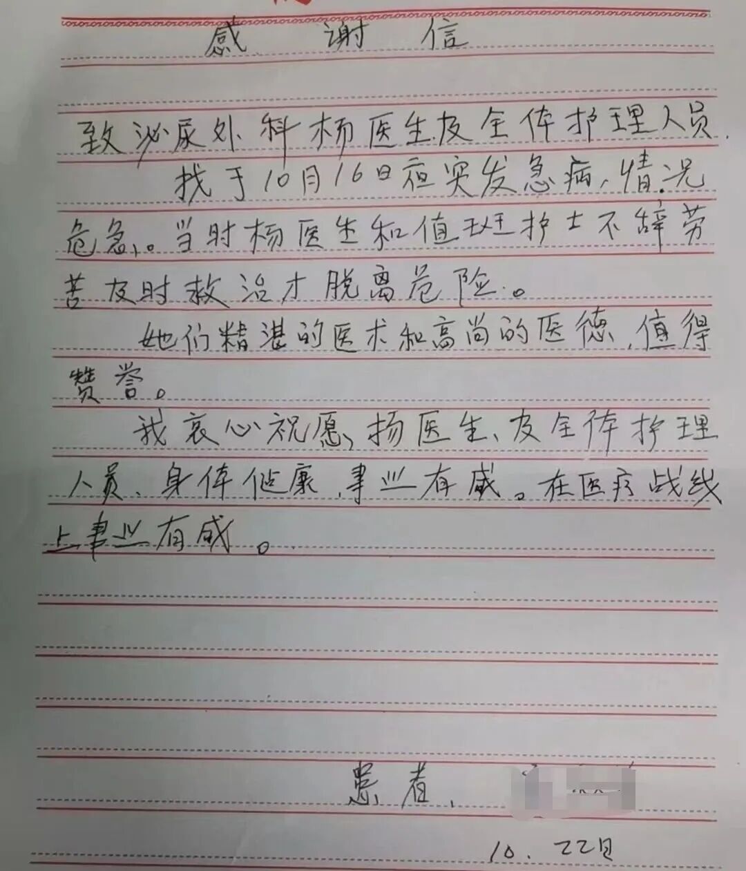 為感謝楊艷霞醫(yī)生的及時救治和護士們的貼心照顧,出院后患者特意寫下一封感謝信,字里行間滿是對楊醫(yī)生專業(yè)醫(yī)術(shù)、敬業(yè)精神和人文關(guān)懷的由衷贊譽,也表達了對醫(yī)院泌尿外科醫(yī)療服務(wù)的高度認可。