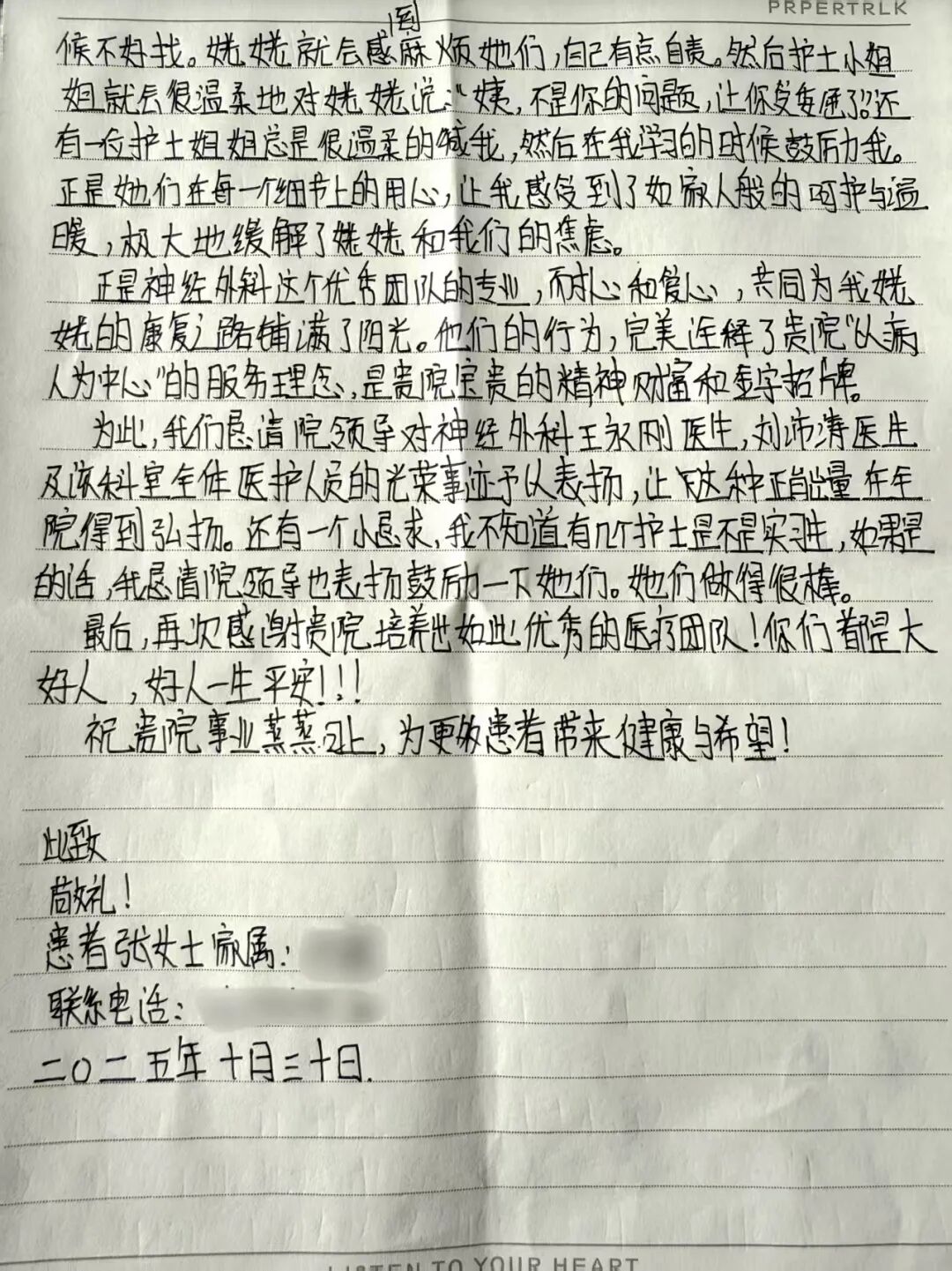 據(jù)了解,張女士的姥姥因“背部腫物”一直備受困擾,6年前在其他醫(yī)院手術(shù)治療后效果不佳,1年內(nèi)復發(fā),腫物逐漸增大,并出現(xiàn)肩部活動受限伴肩部疼痛。來到市二院后神經(jīng)外科醫(yī)生立即進行手術(shù),因術(shù)中腫物與周圍組織粘連嚴重,手術(shù)歷時近2個小時,術(shù)后恢復良好。“我的姥姥年紀大了,耳朵有點背,說話總是反反復復,啰啰嗦嗦的。說實在的,有時候我都會覺得有點煩。可是從住院以來,劉沛濤主任、王永剛醫(yī)生,還有那些美麗可愛的護士小姐姐們和帥氣的護士小哥哥,從來沒有表現(xiàn)出一點點不耐煩。他們總是耐心地聽姥姥講,一遍遍地解釋給她聽,直到她聽懂為止。”張女士的表揚信中字里行間包含著對神經(jīng)外科整個醫(yī)護團隊暖心服務(wù)的認可與贊美。