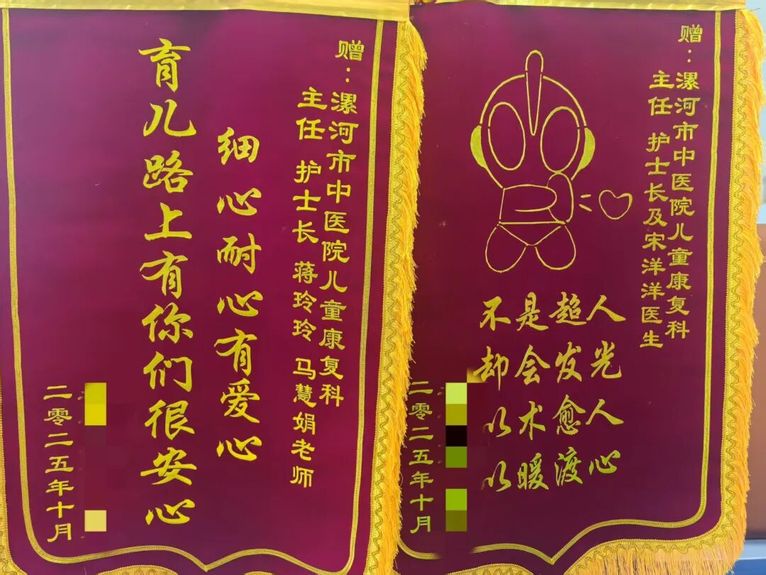 近日,漯河市中醫(yī)院兒童康復(fù)科收到患兒家屬贈送的兩面錦旗,分別寫有 “細心耐心有愛心,育兒路上有你們很安心。”“不是超人卻會發(fā)光,以樹育人以暖渡心”的暖心字樣。家屬以此表達對兒科副主任鄭芳麗,護士長王莉,主管醫(yī)生宋洋洋及治療師蔣玲玲、馬慧娟精湛技術(shù)和優(yōu)質(zhì)服務(wù)的肯定與感謝。
