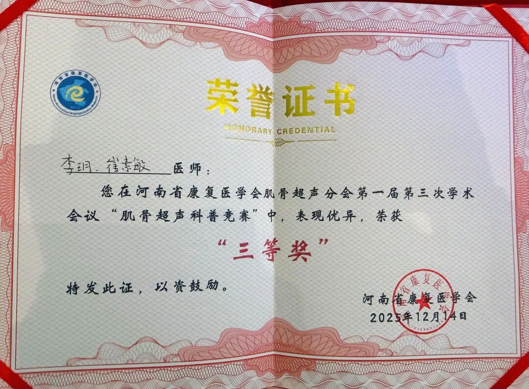 漯河市中醫(yī)院康復院區(qū)李玥、崔素敏榮獲省康復醫(yī)學會肌骨超聲分會科普競賽三等獎