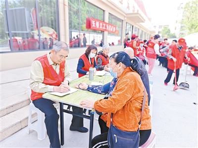 4月20日,在召陵區(qū)煙廠花園,趙國鎖(左一)為居民測量血壓、記錄數(shù)據(jù)。