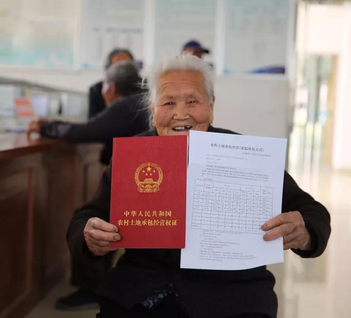 △2017年4月5日,江蘇省海安縣南莫鎮(zhèn)唐莊村1組村民丁桂英喜領(lǐng)《農(nóng)村土地承包經(jīng)營權(quán)證》。