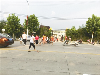 當天下午,記者來到位于太行山路北段東側(cè)的孟廟鎮(zhèn)中心幼兒園門口。正值幼兒園放學時間,接送孩子的家長較多,部分家長把車輛停在了學校對面,接到孩子后需要穿過馬路回家。因為路上沒有設(shè)置安全警示牌,也沒有減速帶、斑馬線等交通標識,家長帶著孩子在車流中穿梭(如圖)。
