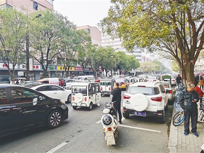 下午3時(shí)40分,記者在前往漯河育才學(xué)校的路上發(fā)現(xiàn)泰山路從遼河路口起往北出現(xiàn)大擁堵,機(jī)動(dòng)車道兩側(cè)停滿了接學(xué)生放學(xué)的車輛,各種三輪車和自行車則占據(jù)了非機(jī)動(dòng)車道。尤其是學(xué)校門前的機(jī)動(dòng)車道兩側(cè)都只剩下一個(gè)車道通行,加上多路公交車通過,整條道路擁堵不堪。在學(xué)校大門前,記者未發(fā)現(xiàn)交警在現(xiàn)場(chǎng)指揮,未見管理道路交通的志愿者,只見多名身著志愿者服裝的家長(zhǎng)志愿者和教師志愿者在維持學(xué)生隊(duì)伍秩序。
