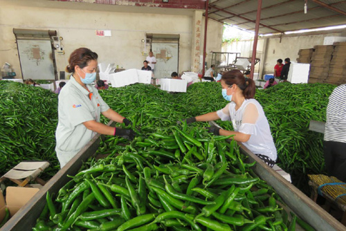 圖為臨潁縣王孟鎮(zhèn)石拐村自安產業(yè)扶貧基地的社員們,在冷庫為辣椒分揀、裝箱、冷藏時的情景。