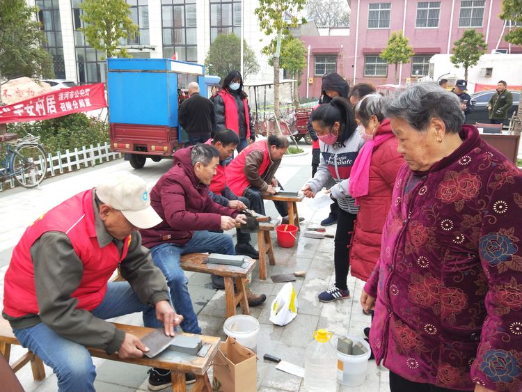 活動現(xiàn)場剛布置好,村民們就拿著菜刀、剪刀,來到了活動現(xiàn)場等候,見到到來的村民們,磨刀師傅王躍偉、王留義、馮三喜、閆軍倉、王秀根立馬擺開架勢給大家磨起了刀,大家都露出了滿意的笑容。村民們紛紛表示:“磨剪子戧菜刀”的手藝人越來越少了,在家里也很少聽到他們的吆喝聲了,家里很多刀具用的時間長了,都有點鈍了,有的放的時間長了,都生銹了,燕山路社區(qū)能來到我們村,做這樣的義務活動,真是太方便了。