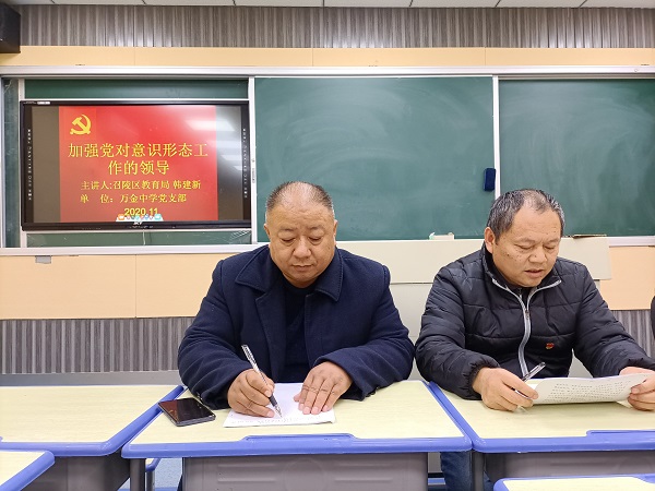 為加強黨對意識形態(tài)工作的領(lǐng)導(dǎo),穩(wěn)固基層黨員教師的意識形態(tài)工作,11月30日下午,召陵區(qū)教育局韓建新同志,在萬金中學(xué)東校區(qū),給萬金鎮(zhèn)全體黨員教師上了《加強和改進黨對意識形態(tài)工作的領(lǐng)導(dǎo)》的思政課,此次會議由萬金中學(xué)黨支部副書記張曉斌同志主持。