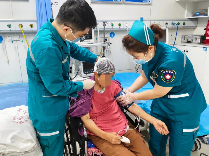 7月16日,大雨不停歇,該院急診科全天出車近20次。有的路段水深難行,醫(yī)務(wù)人員淌水到病人家中,第一時(shí)間為患者診治。在急診室內(nèi),急診醫(yī)生為外傷患者包扎傷口后詢問患者情況,護(hù)士長段銳為患者測量生命體征。