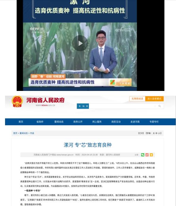 2024年,在市級以上媒體宣傳報道90余篇?!秾?ldquo;芯”致志育良種》被省政府官網(wǎng)報道,科技服務春耕春管工作被《河南日報》《科技日報》報道,《選育優(yōu)質(zhì)麥種提高抗逆性和抗病性》小麥新品種選育工作4月26日被央視報道。