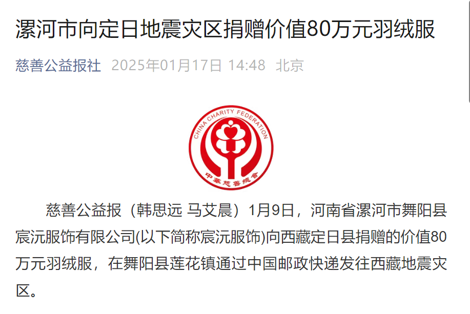 1月9日,河南宸沅服飾有限公司總經(jīng)理李書鋒聯(lián)系市縣慈善總會,捐贈價值80萬元的羽絨服,通過中國郵政快遞專車發(fā)往西藏災(zāi)區(qū)。