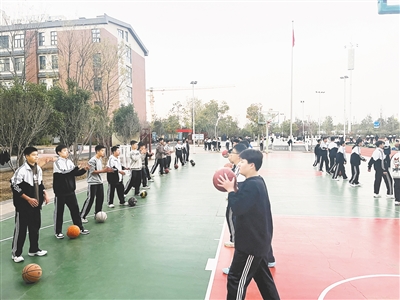 3月6日9點(diǎn)40分,下課鈴聲響起,郾城中學(xué)的學(xué)生迅速涌向操場。學(xué)生們排好隊(duì),在老師的帶領(lǐng)下有節(jié)奏地跑步、拉伸放松,分組參與立定跳遠(yuǎn)、跳繩、籃球等豐富多彩的體育項(xiàng)目。每一組學(xué)生都有體育教師指導(dǎo),確保他們掌握正確的運(yùn)動(dòng)技巧,操場上洋溢著青春的氣息。