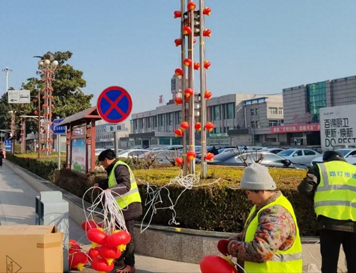 2025年1月20日下午,在河南省漯河市區(qū)火車站廣場,工作人員正在路邊忙碌,他們認(rèn)真串接燈籠,有序懸掛裝飾,相互協(xié)作,高效推進(jìn)市區(qū)迎春燈飾安裝工作,全力扮靚城市名片。