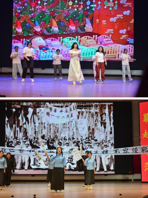 當(dāng)天演出在漯彎春韻的舞蹈中拉開帷幕,從《寶玉大婚》《西安事變》《白雪公主和丫鬟們》《破曉》等經(jīng)典劇目的深度改編,到聚焦校園生活、社會(huì)熱點(diǎn)的劇本《再看五分鐘》《當(dāng)考試還剩15分鐘》《誰逼瘋了周日》《回不去的十七歲》等,同學(xué)們以敏銳的觀察力捕捉生活細(xì)節(jié),用戲劇語言傳遞青春思考。高一(13)班的《破曉.她時(shí)代》通過講述一群率先覺醒的女大學(xué)生,沖破了舊思想的牢籠,以青春和熱血,為自由和平等而吶喊;高一(15)班高一(16)班的《文字彼岸的他們》通過時(shí)空交錯(cuò)的敘事,講述了三代女性的讀書世界,倡導(dǎo)讀書的重要性。高一(9)班的《金陵十三釵》則以極具現(xiàn)代感的舞美設(shè)計(jì)和沉浸式表演,賦予傳統(tǒng)故事新的生命力。高一(3)班高一(4)班《回不去的17歲》以兩代人的真實(shí)經(jīng)歷改編,引發(fā)學(xué)生對(duì)青春,責(zé)任和奉獻(xiàn)的思索,引發(fā)了陣陣掌聲。