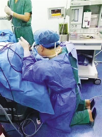3月15日,該患者被推進(jìn)手術(shù)室。因為患者聲帶有腫物,需要在支撐喉鏡下手術(shù)。“對患者進(jìn)行麻醉后,為了更好地暴露手術(shù)視野,看清聲帶腫物,我只能跪在地上進(jìn)行手術(shù),因為只有跪姿時手術(shù)最方便,看到的視野最清晰。”劉世鋒解釋說。