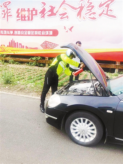 “看到他的車著了火,我就帶著摩托車上的滅火器和同事陳凱一起趕了過去。將火撲滅后,又把電瓶線拆掉,防止危險(xiǎn)發(fā)生。”市交警支隊(duì)秩序管理大隊(duì)騎警中隊(duì)騎警陳彬說,事發(fā)時(shí),他和同事陳凱正在附近執(zhí)行任務(wù)。