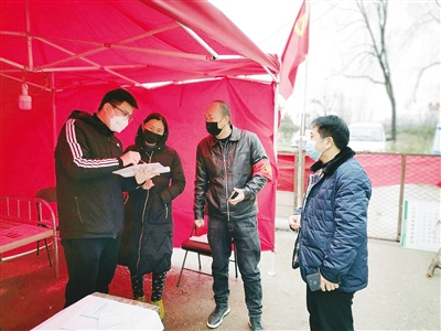 王航(左一)在防控卡點檢查人員登記情況。王航供圖