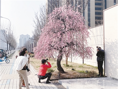 3月14日,在市區(qū)王屋山路蘇荷象灣壹號(hào)小區(qū)門前,兩株盛開的龍梅形成兩團(tuán)巨大的粉色花簇,吸引不少市民圍觀拍照。