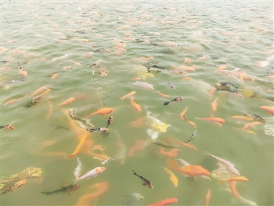 在一方方碧綠的魚(yú)池里,一尾尾花紋各異的錦鯉悠然游動(dòng)。一把餌料撒下去,魚(yú)群爭(zhēng)先搶食,正紅、金黃、黑白……擺動(dòng)著曼妙身姿的錦鯉與波光粼粼的水面相映成趣,構(gòu)成一幅恬淡幽靜的美妙畫(huà)卷。