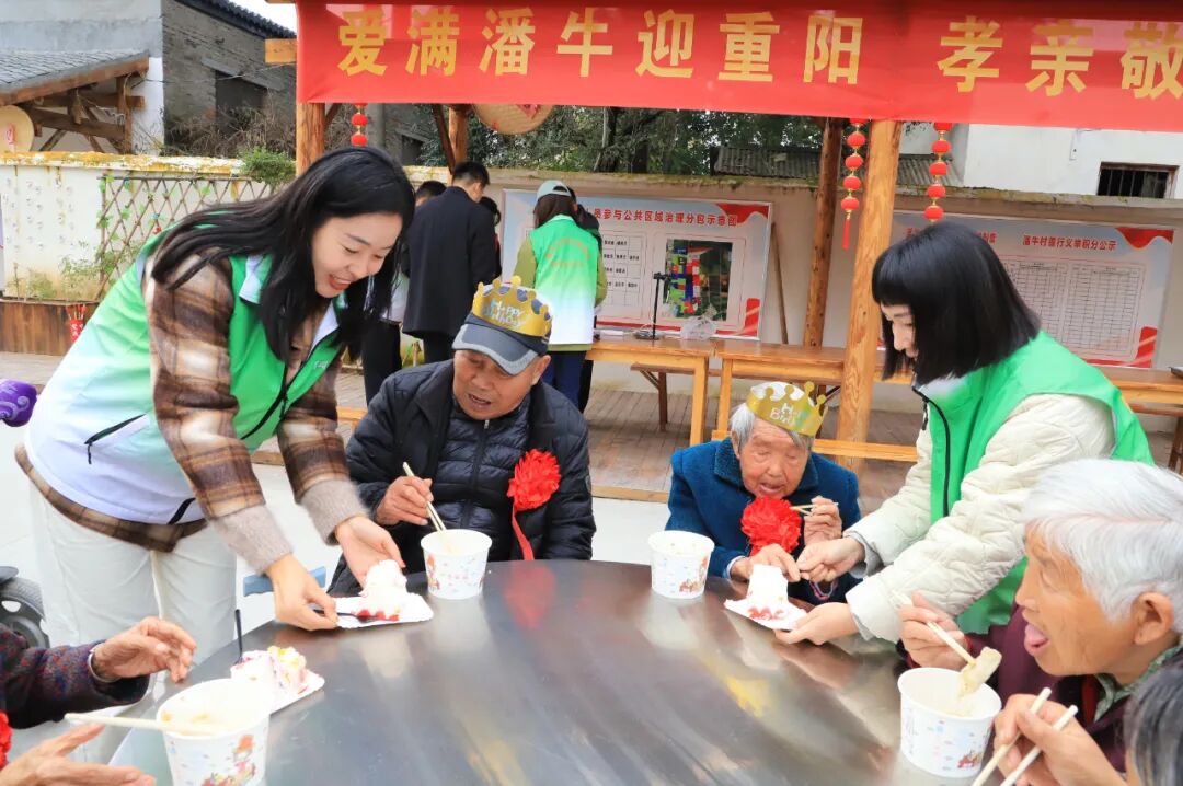 幸福苑內(nèi),“壽星賀重陽(yáng)”儀式溫馨舉行。駐村第一書(shū)記趙基元與志愿者們?yōu)榇謇?0歲以上高齡老人佩戴大紅花、生日帽,送上定制壽星大蛋糕。“沒(méi)想到這么大年紀(jì),村里還一直惦記著我們……”91歲的賈奶奶激動(dòng)不已,樸實(shí)話語(yǔ)里滿是感動(dòng)。