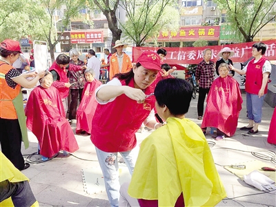 5月13日上午8點半,在市區(qū)煙廠花園廣場,閆海燕半蹲著身體,拱著腰,一手拿著剪刀,一手拿著梳子,認(rèn)真地為一位老人理發(fā)。“我以前在家經(jīng)常幫奶奶剪頭發(fā),現(xiàn)在經(jīng)過一年多的鍛煉,手藝更加嫻熟了。”閆海燕笑著說。