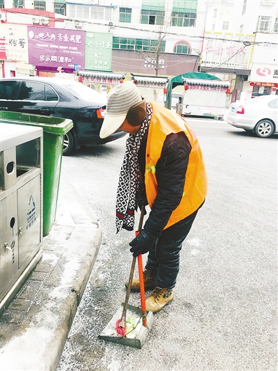 2月10日上午,室外氣溫很低,天空飄著雪花,記者在市區(qū)黃河西路見到了正在保潔路面的環(huán)衛(wèi)工人肖中周。皮手套、耳暖、圍巾、帽子,雖然他全副武裝,可仍抵不住這冬日的嚴(yán)寒,臉頰被凍得通紅。他告訴記者,凌晨4點(diǎn)他就起床到達(dá)了自己負(fù)責(zé)的路段,開始打掃路面。過年期間,為了保證路面的干凈整潔,他和負(fù)責(zé)該路段的另一名環(huán)衛(wèi)工輪流值班。