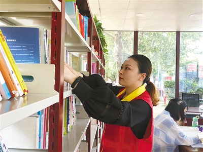 志愿者周莉漫在整理書(shū)架。