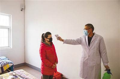 工作人員為余旺梅測量體溫。