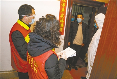 郾城區(qū)沙北街道泰山社區(qū)有物業(yè)管理健全的小區(qū),也有開放式小區(qū),還有20多個(gè)家屬院,常住人口近萬人。從大年三十開始,泰山社區(qū)18名工作人員一直堅(jiān)守在防控一線,用實(shí)際行動(dòng)守護(hù)社區(qū)居民安全。圖為社居委工作人員登門為居家隔離者進(jìn)行身體檢測(cè)。記者 楊 光 攝