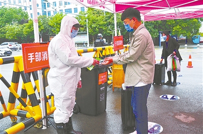 “媽媽再見,放心吧,我會照顧好自己的!”來自許昌的程佳寶同學(xué)到了學(xué)校門口后,和爸媽擁抱惜別,然后進入測溫消毒防疫通道,進行身份核驗、體溫測量、行李消毒、更換口罩、手部消毒后,進入闊別已久的校園。