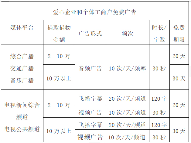 1、服務(wù)對象:在疫情防控期間,凡向我市防疫一線捐款捐物的企業(yè)、個(gè)體工商戶(包括本地和外地企業(yè)),均可享受免費(fèi)廣告服務(wù)。
