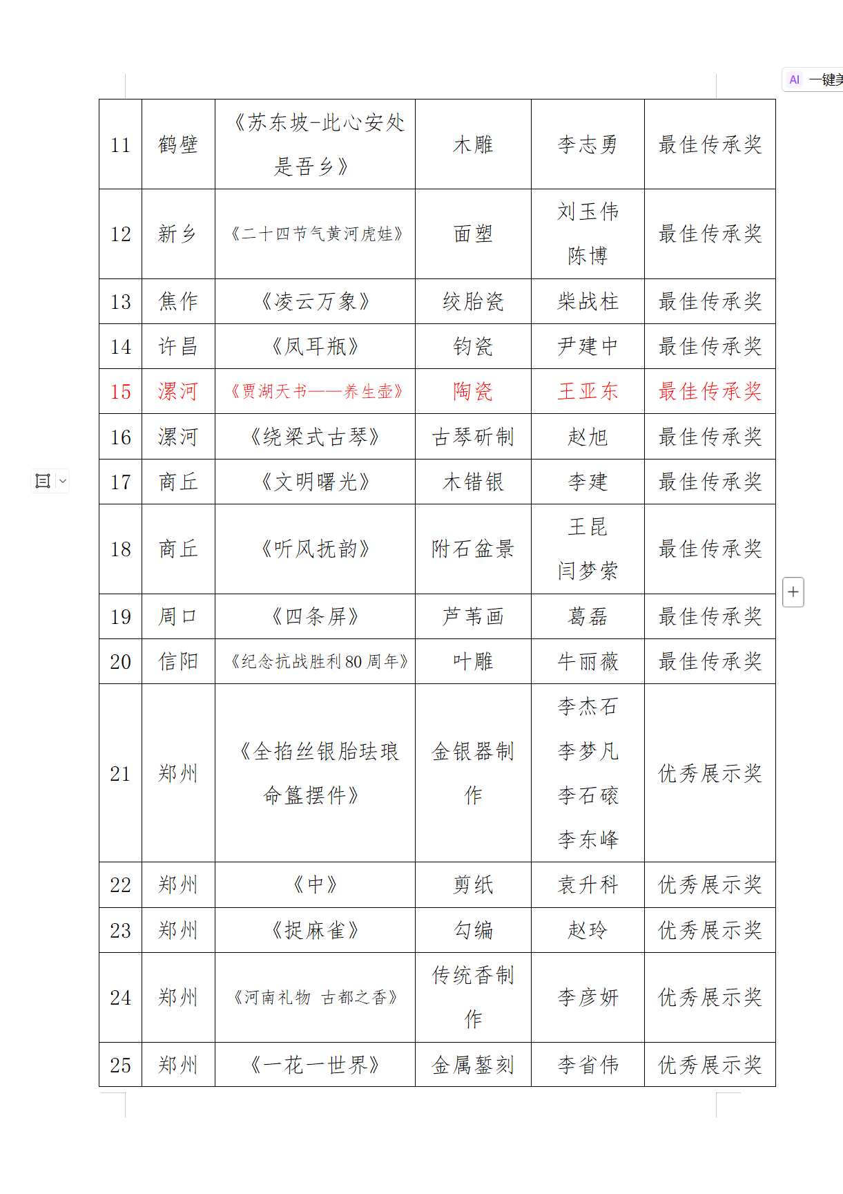 2025 年 12 月 10 日,河南省文化和旅游廳公示 “古藝心聲 匠心中原” 第六屆河南民間藝術(shù)展評(píng)審結(jié)果,漯河市舞陽縣文化館選送的《賈湖天書養(yǎng)生壺》榮獲此次展覽最高獎(jiǎng) ——最佳傳承獎(jiǎng)。